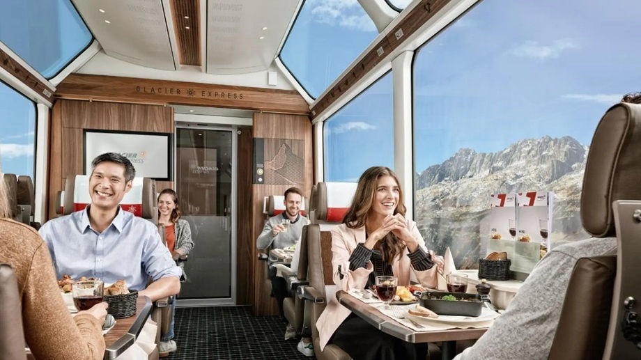 Para disfrutar en primera fila de las vistas de los Alpes suizos, opte por el Glacier Express. A lo largo de este trayecto, que comienza cerca del Matterhorn en Zermatt y termina en la ciudad turística de St Moritz, los viajeros pueden disfrutar de impresionantes vistas a través de las ventanas panorámicas.
