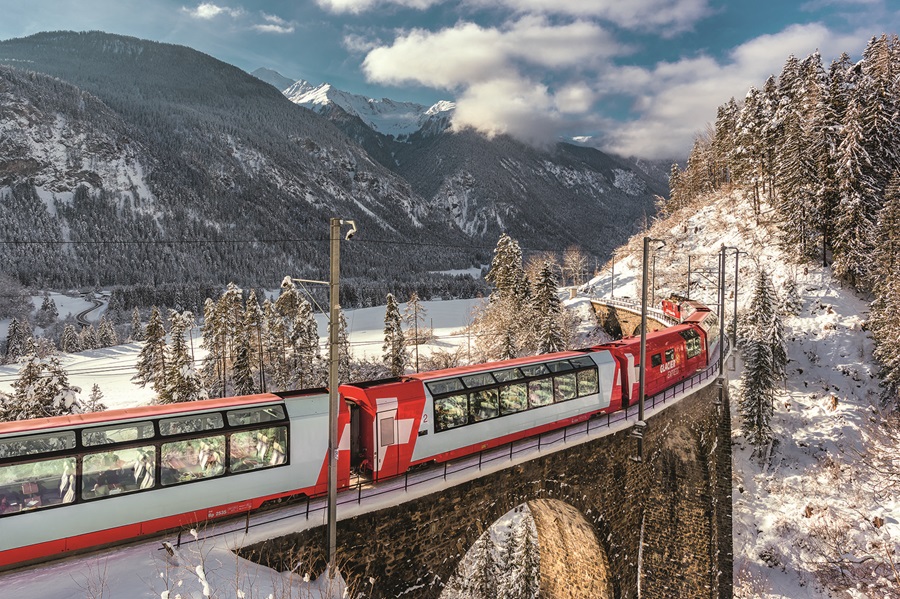 Esta ruta alpina lleva a los pasajeros de Tirana (Italia) a St Moritz (Suiza), atravesando 55 túneles y 196 puentes, pasando por lagos de aguas cristalinas e impresionantes cimas que aparecen al alcance de la mano desde sus vagones panorámicos.