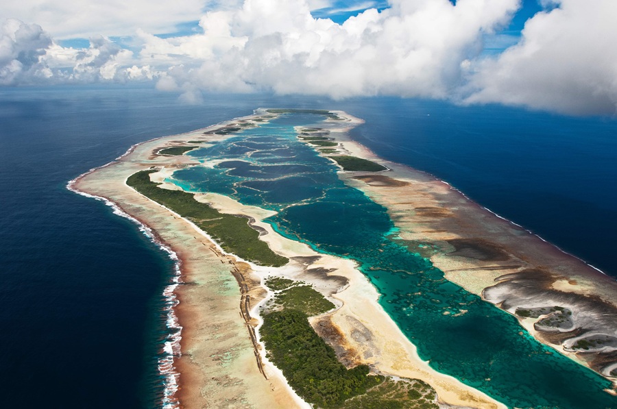 Caroline Atoll, en Kiribati, es un atolón remoto con arrecifes vibrantes de 300 especies de corales y 1,200 peces, donde lagunas poco profundas brillan con colores pastel. Su aislamiento (6 m sobre el mar) lo hace un paraíso frágil.