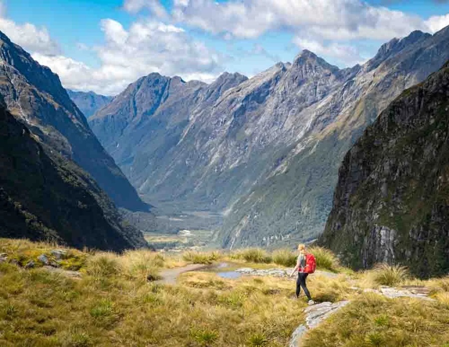 El Milford Track, en Fiordland, Nueva Zelanda, es un sendero de 53.5 km por fiordos, cascadas y bosques templados, llamado «la caminata más fina del mundo». Su dificultad media, con puentes colgantes y lluvias frecuentes, ofrece vistas de Mitre Peak.